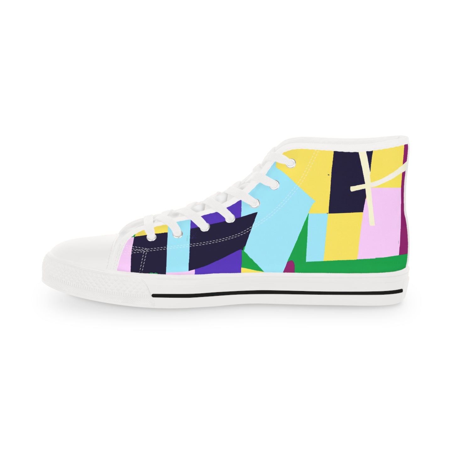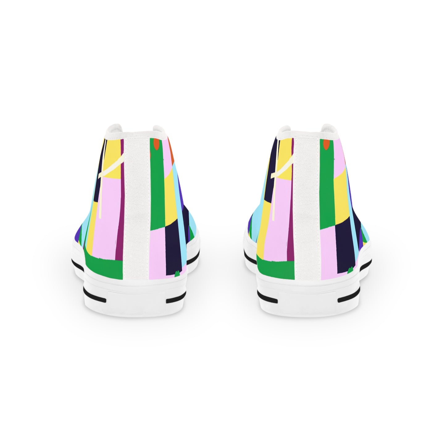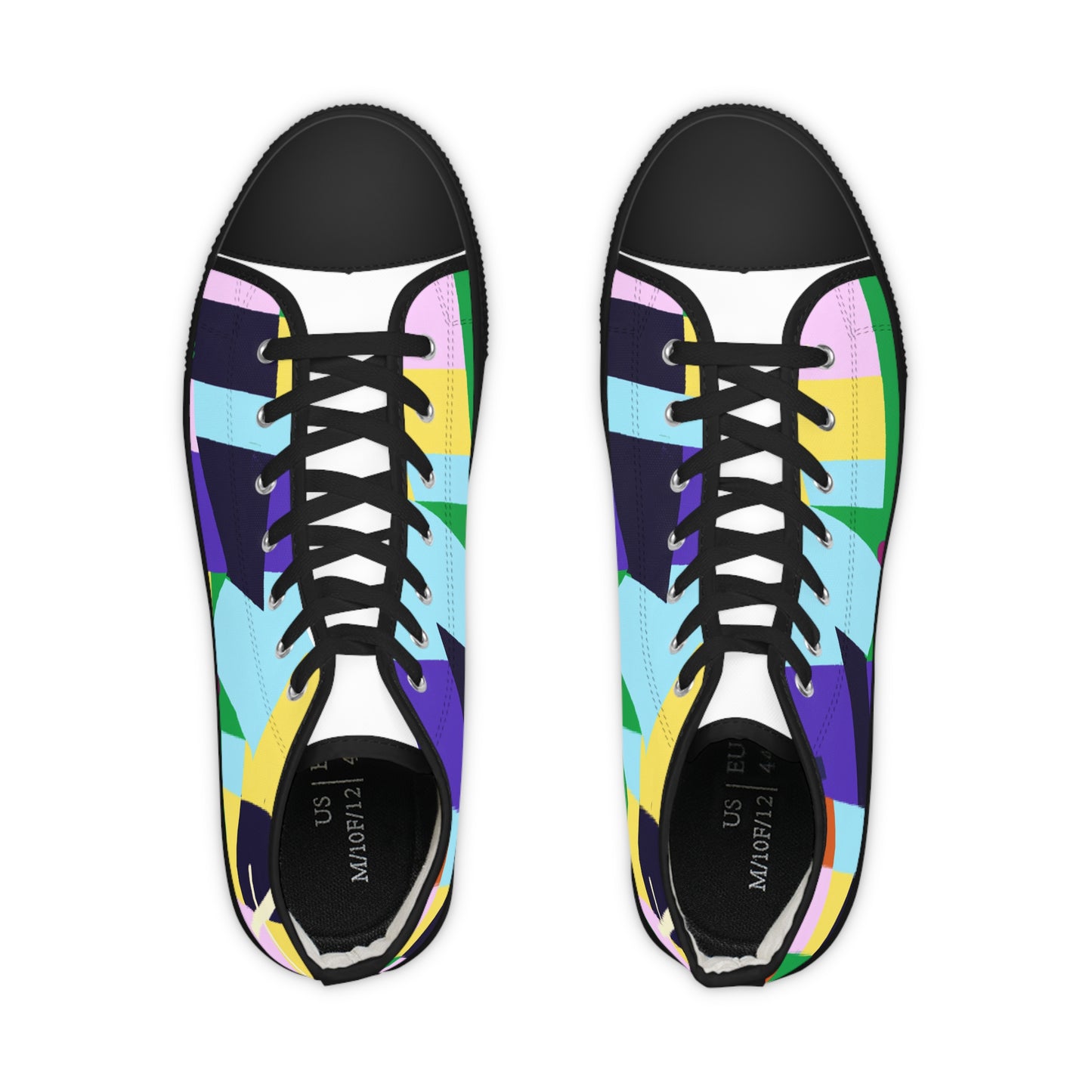 Tactile and vibrant, these geometric-art high top shoes are unlike any other. Combining eye-catching artistic elements with sleek comfort features, they're sure to keep you agile and in-style for hours. The bright hues will make a statement—and the sturdy rubber sole ensures that each step is secure. Bold, beautiful and comfortable - you won't want to take them off! #HighTops #Shoes #GeometricArt #Scheme #ColourPop #Vibrant #Aesthetic #StreetStyle #Comfort #BrightColors #SoleSecurity