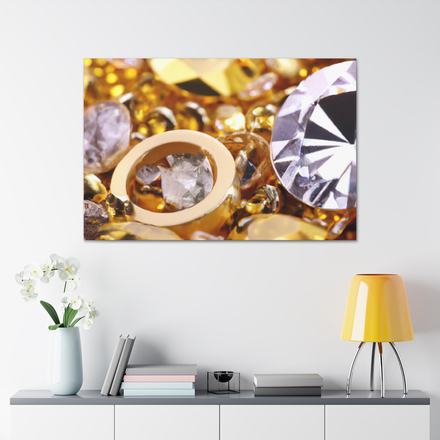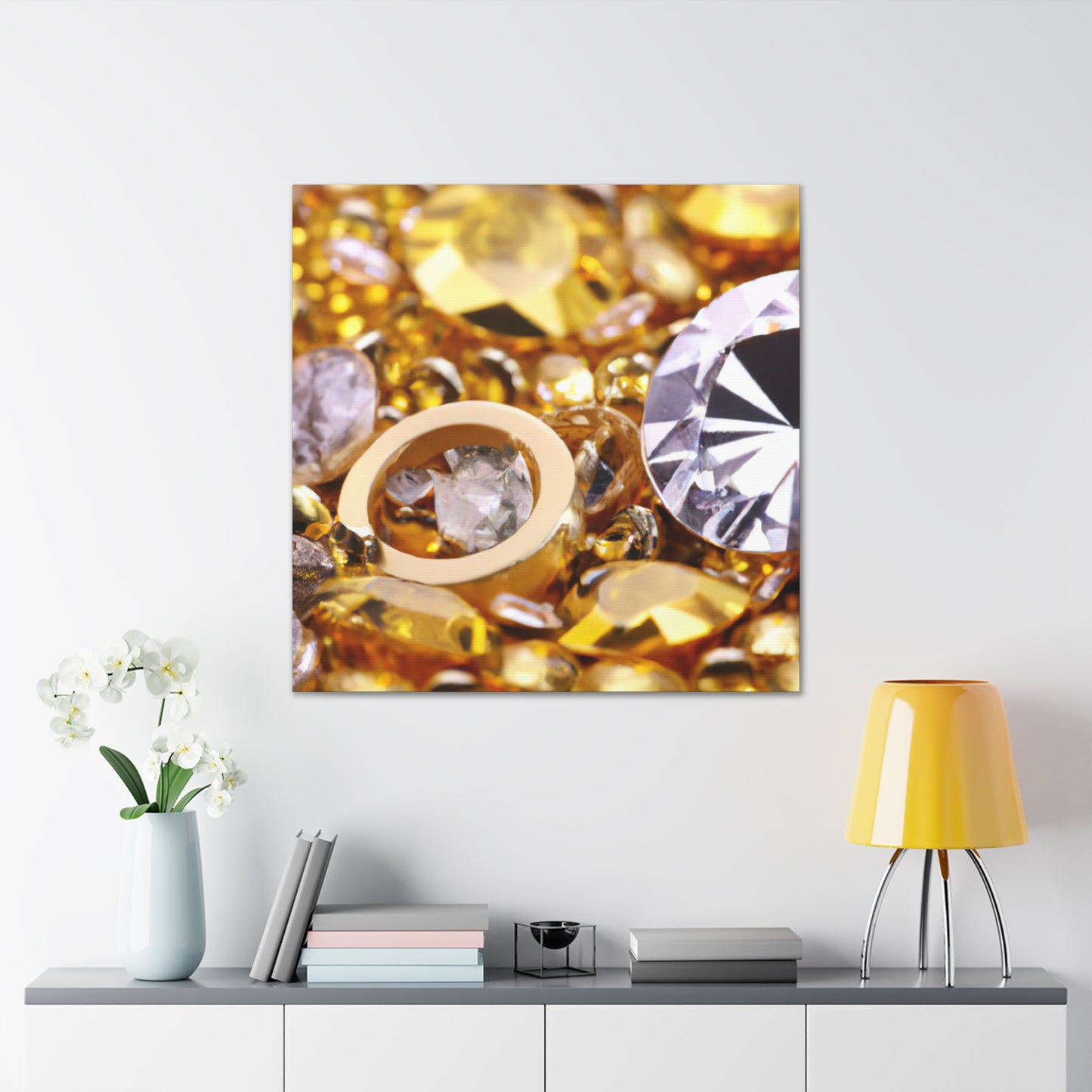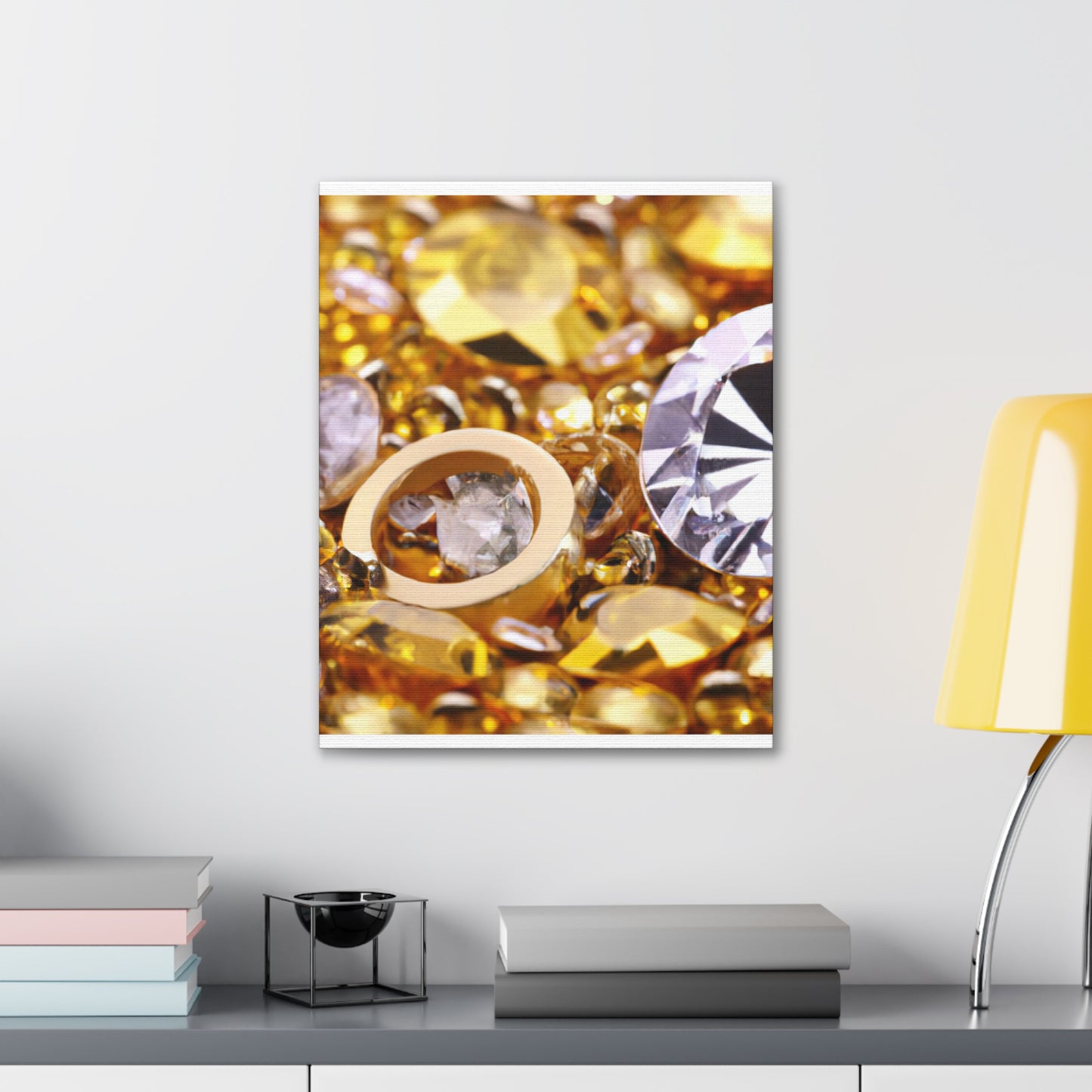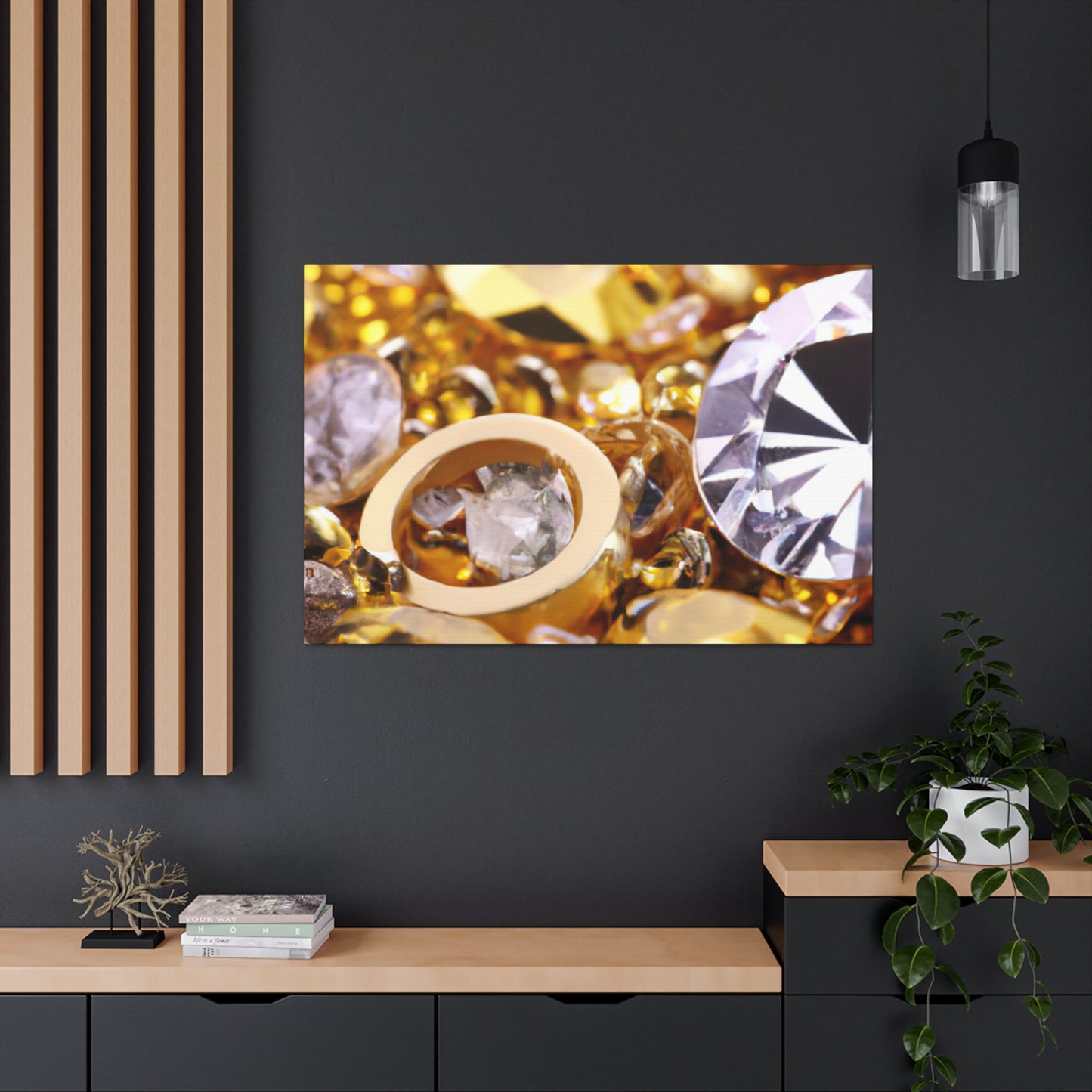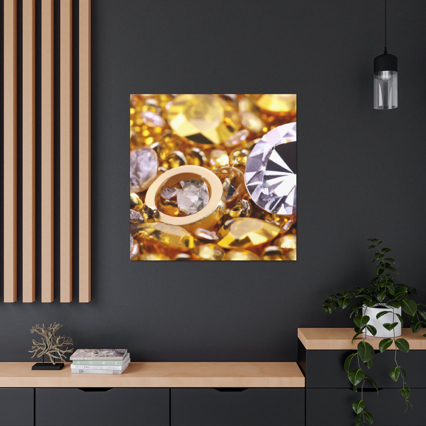 This unique canvas is the perfect statement piece. Gleaming gold and glittering diamond accents create an eye-catching design. Whether displayed solo or paired with other pieces, this canvas will instantly elevate the decor of any room! #artdecor #interiordesign #statementpiece #golddecor #Canvas #diamonds #luxuryart #statementart #interiordecor #homeredecor #classyinteriors